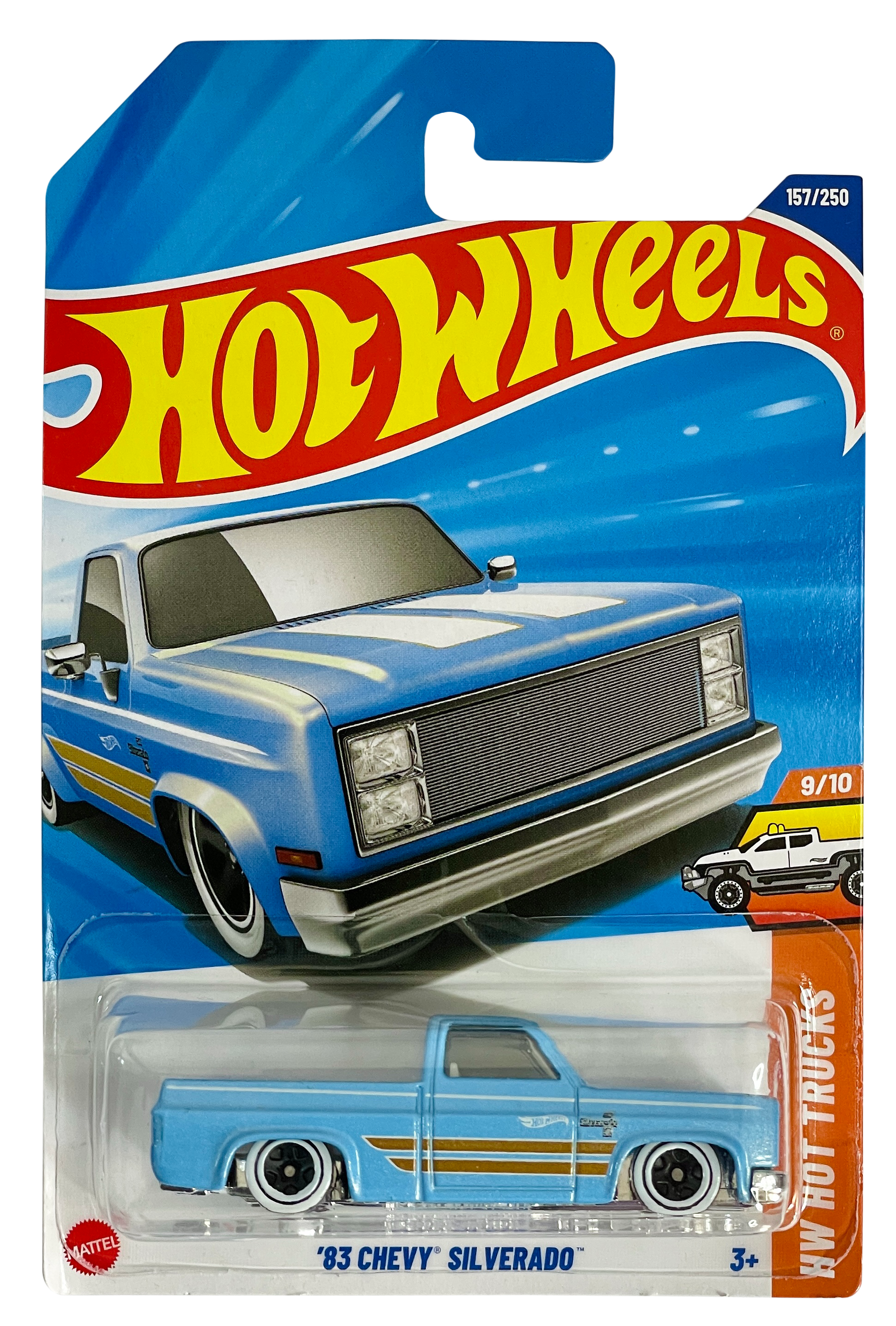 The Hot Wheels '83 Chevy Silverado is a popular 1:64 scale die-cast model representing a modified "square body" pickup truck. It features a lowered stance, customized grille, and often an exposed rear drivetrain. This model is frequently released in "Hot Trucks" or "Then and Now" series.