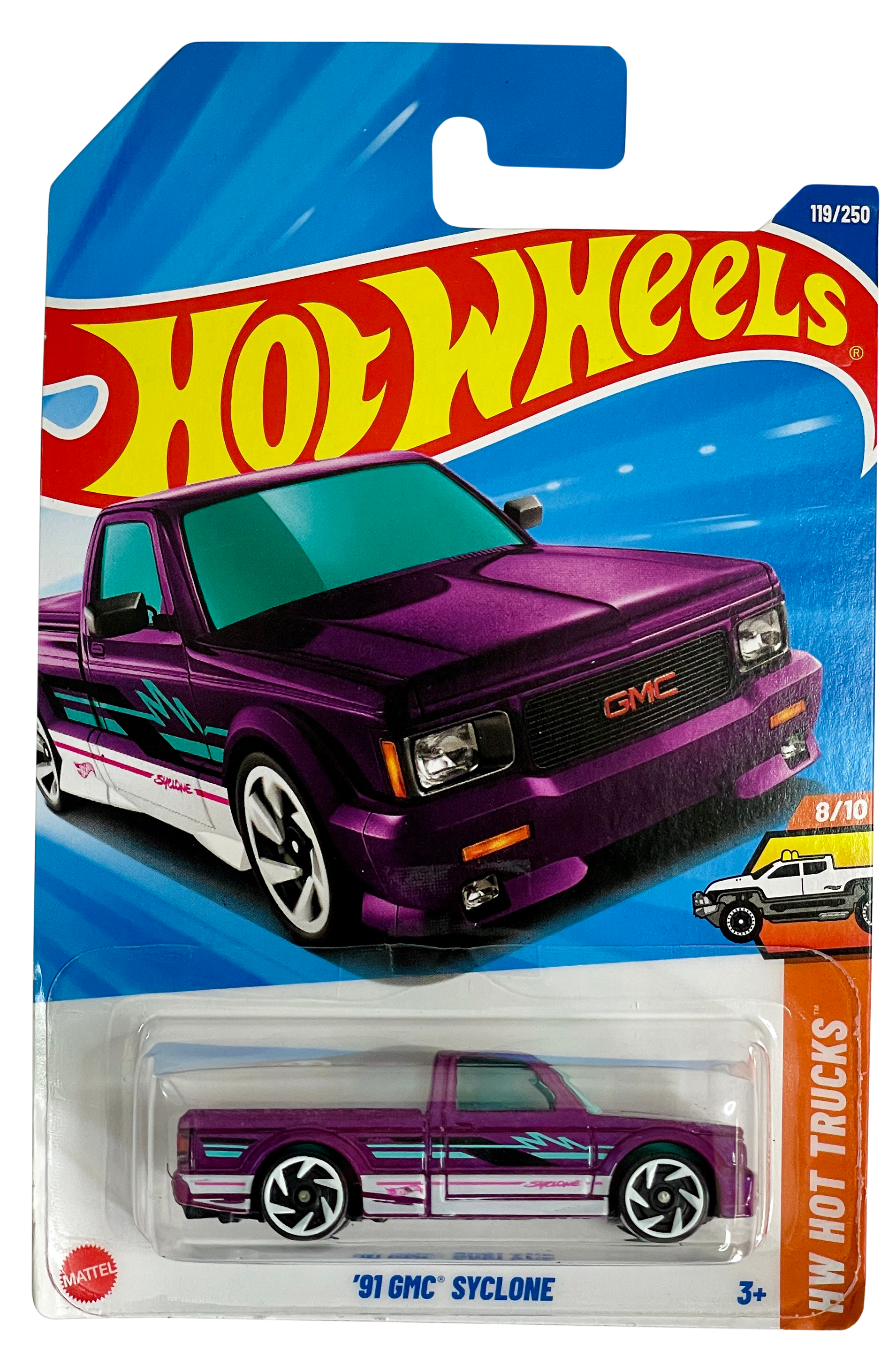 The Hot Wheels '91 GMC Syclone is a popular 1:64 scale die-cast replica of the legendary 1991 turbocharged, all-wheel-drive performance pickup, known for its surprising speed, often appearing in series like HW Hot Trucks or Boulevard, featuring detailed styling, metal construction, and various colors (red, white, purple) to capture the iconic, low-slung look of the groundbreaking real truck