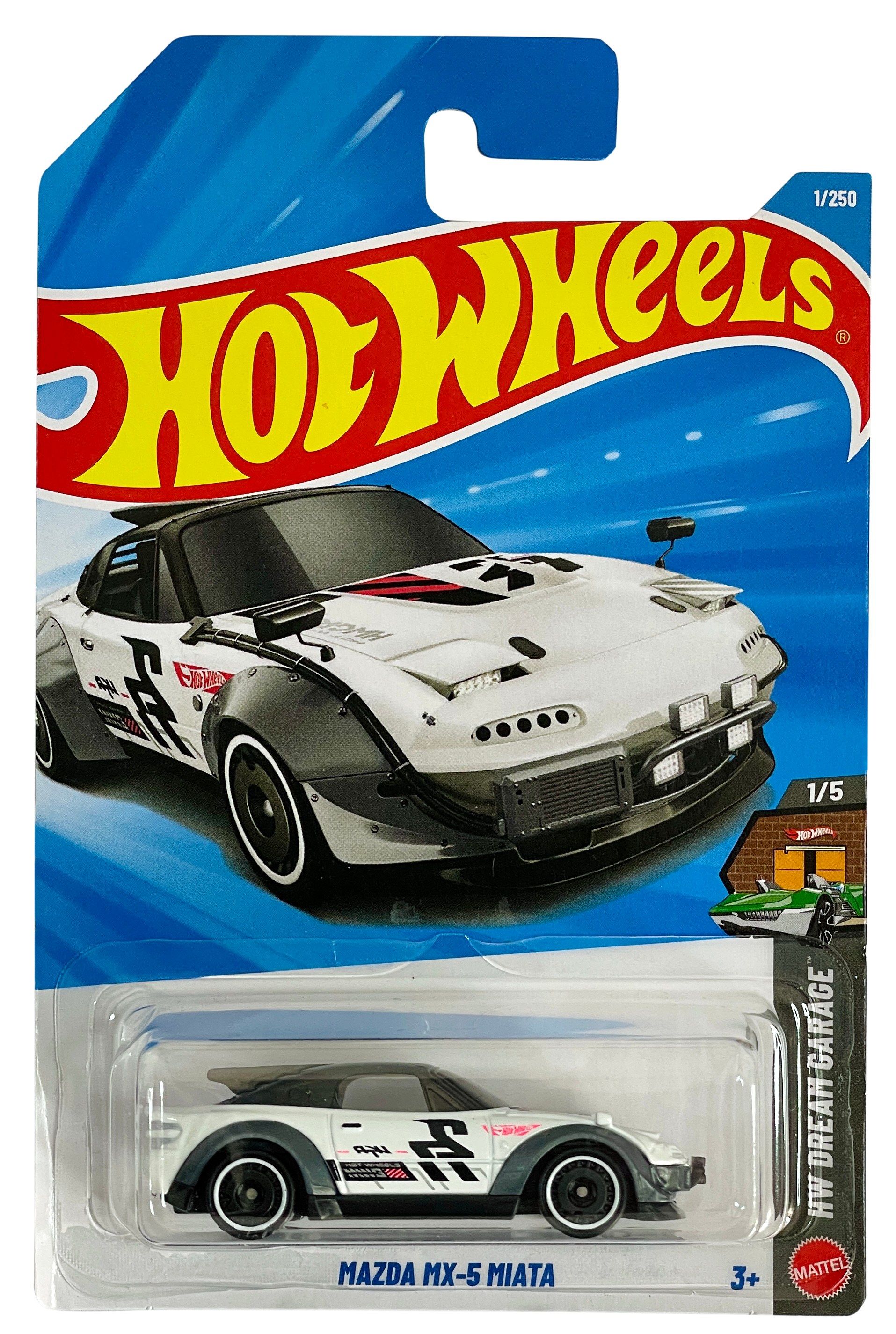 The 2025/2026 Hot Wheels White Mazda MX-5 Miata (1/250) is a 1:64 scale die-cast car featured in the HW Dream Garage series (often 2/5 or 1/5 in the sub-series). Released as part of the 2025/2026 mainlines, this model features a clean white paint job, typically with a right-hand drive configuration, and is a detailed representation of the iconic roadster.