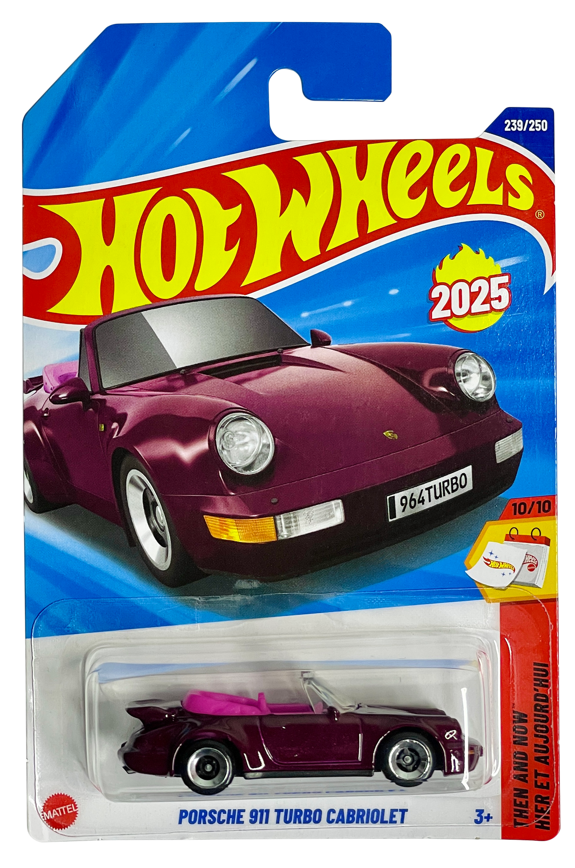 The 2025 Hot Wheels Porsche 911 Turbo Cabriolet (specifically based on the 964 generation) is a 1:64 scale die-cast car featured in the "Then and Now" series (239/250). It is characterized by a burgundy/maroon finish, a striking pink interior, and a detailed "whale tail" rear spoiler, showcasing a 1990s style convertible aesthetic.